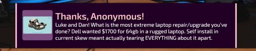Thanks, Anonymous! Luke and Dan! What is the most extreme laptop repair/upgrade you've done? Dell wanted $1700 for 64gb in a rugged laptop. Self install in current skew meant actually tearing EVERYTHING about it apart.
