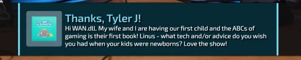 Thanks, Tyler J! Hi WAN.dLL My wife and I are having our first child and the ABCs of gaming is their first book! Linus - what tech and/or advice do you wish you had when your kids were newborns? Love the show!