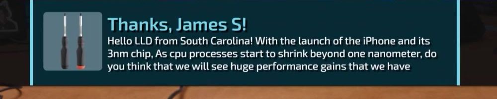 Thanks, James S! Hello LLD from South Carolina! With the launch of the iPhone and its 3nm chip, As cpu processes start to shrink beyond one nanometer, do you think that we will see huge performance gains that we have