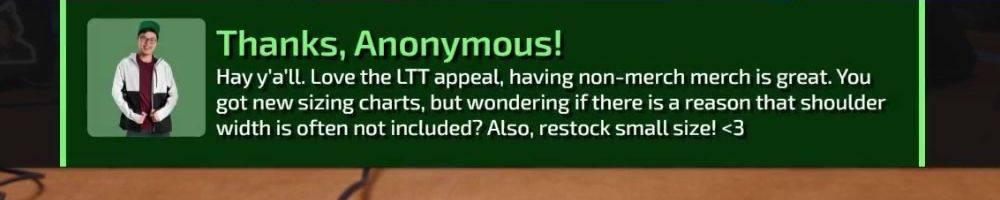 Thanks, Anonymous! Hay y'a'll. Love the LTT appeal, having non-merch merch is great. You got new sizing charts, but wondering if there is a reason that shoulder width is often not included? Also, restock small size! <3