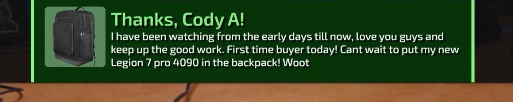 Thanks, Cody A! I have been watching from the early days till now, love you guys and keep up the good work. First time buyer today! Cant wait to put my new Legion 7 pro 4090 in the backpack! Woot