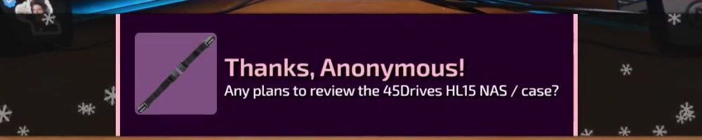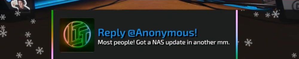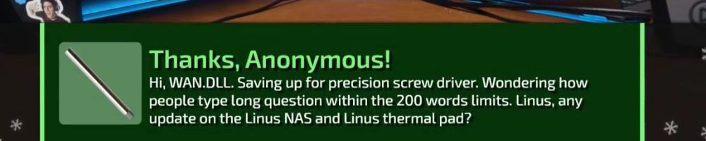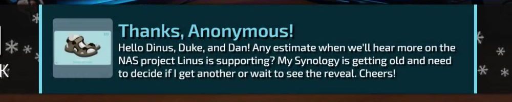 Hello Dinus, Duke, and Dan! Any estimate when we'll hear more on the NAS project Linus is supporting? My Synology is getting old and need to decide if I get another or wait to see the reveal. Cheers!