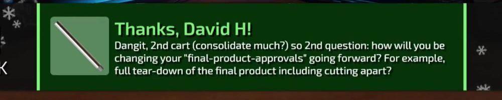 Dangit, 2nd cart (consolidate much?) so 2nd question: how will you be changing your "final-product-approvals" going forward? For example, full tear-down of the final product including cutting apart?