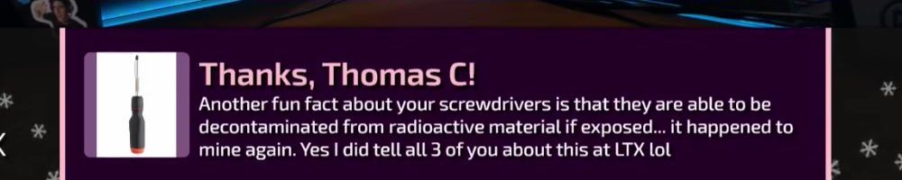 Another fun fact about your screwdrivers is that they are able to be decontaminated from radioactive material if exposed... it happened to mine again. Yes I did tell all 3 of you about this at LTX lol