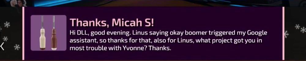 Hi DLL, good evening. Linus saying okay boomer triggered my Google assistant, so thanks for that, also for Linus, what project got you in most trouble with Yvonne? Thanks.