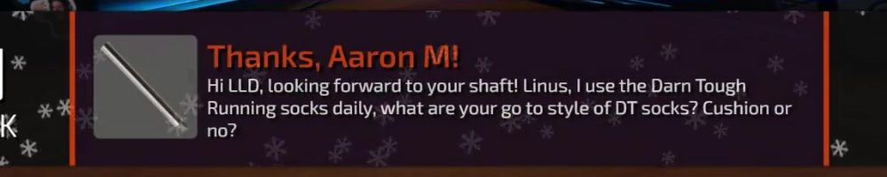 Hi LLD, looking forward to your shaft! Linus, I use the Darn Tough Running socks daily, what are your go to style of DT socks? Cushion or no?