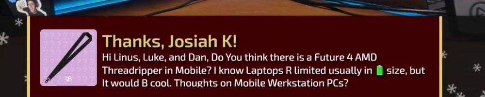Hi Linus, Luke, and Dan, Do You think there is a Future 4 AMD Threadripper in Mobile? I know Laptops R limited usually in 🅰 size, but it would B cool. Thoughts on Mobile Werkstation PCs?