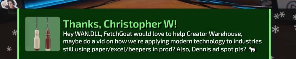 Hey WAN.DLL, FetchGoat would love to help Creator Warehouse, maybe do a vid on how we're applying modern technology to industries still using paper/excel/beepers in prod? Also, Dennis ad spot pls?