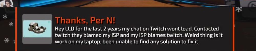 Hey LLD for the last 2 years my chat on Twitch wont load. Contacted twitch they blamed my ISP and my ISP blames twitch. Weird thing is it work on my laptop, been unable to find any solution to fix it