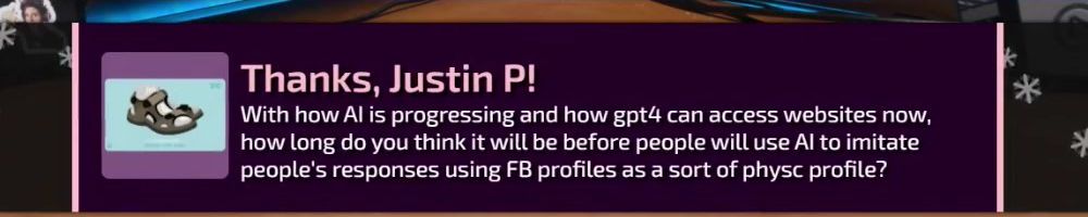 With how AI is progressing and how gpt4 can access websites now, how long do you think it will be before people will use AI to imitate people's responses using FB profiles as a sort of physc profile?