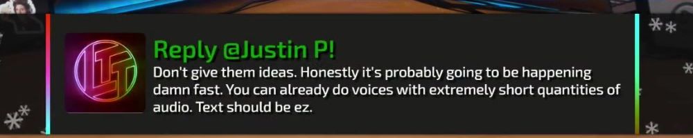 Don't give them ideas. Honestly it's probably going to be happening damn fast. You can already do voices with extremely short quantities of audio. Text should be ez.
