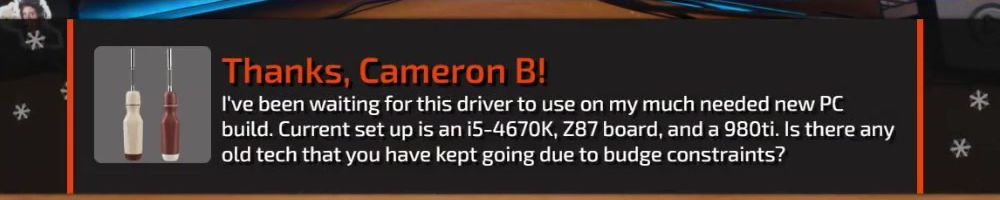 I've been waiting for this driver to use on my much needed new PC build. Current set up is an i5-4670K, Z87 board, and a 980ti. Is there any old tech that you have kept going due to budge constraints?
