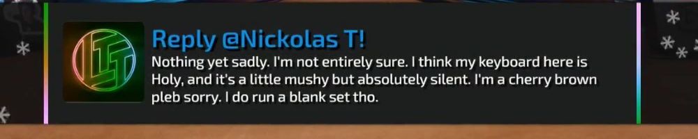 Nothing yet sadly. I'm not entirely sure. I think my keyboard here is Holy, and it's a little mushy but absolutely silent. I'm a cherry brown pleb sorry. I do run a blank set tho.