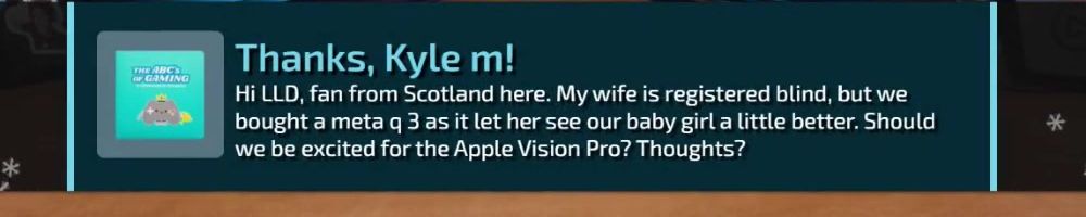 Hi LLD, fan from Scotland here. My wife is registered blind, but we bought a meta q 3 as it let her see our baby girl a little better. Should we be excited for the Apple Vision Pro? Thoughts?