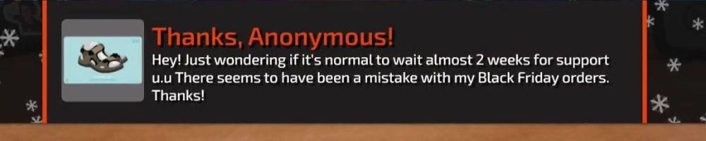 Hey! Just wondering if it's normal to wait almost 2 weeks for support u.u There seems to have been a mistake with my Black Friday orders. Thanks!