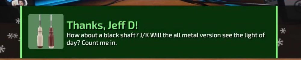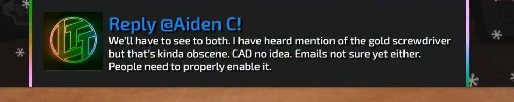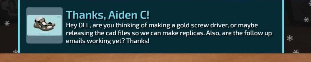Hey DLL, are you thinking of making a gold screw driver, or maybe releasing the cad files so we can make replicas. Also, are the follow up emails working yet? Thanks!