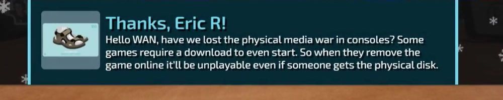 Hello WAN, have we lost the physical media war in consoles? Some games require a download to even start. So when they remove the game online it'll be unplayable even if someone gets the physical disk.