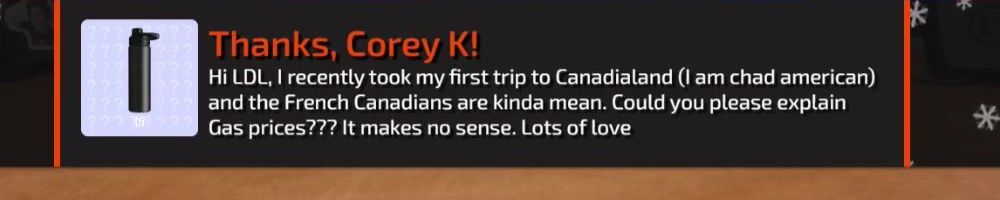 Hi LDL, I recently took my first trip to Canadialand (I am chad american) and the French Canadians are kinda mean. Could you please explain Gas prices??? It makes no sense. Lots of love