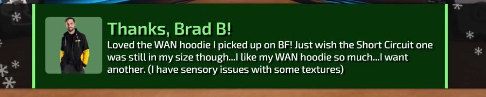 Loved the WAN hoodie I picked up on BF! Just wish the Short Circuit one was still in my size though... I like my WAN hoodie so much... I want another. (I have sensory issues with some textures)