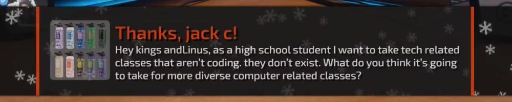 Hey kings and Linus, as a high school student I want to take tech related classes that aren't coding. they don't exist. What do you think it's going to take for more diverse computer related classes?