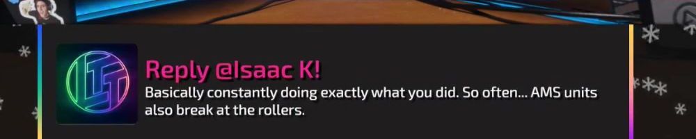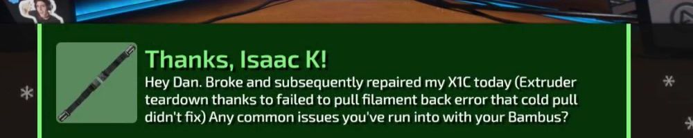 Hey Dan. Broke and subsequently repaired my X1C today (Extruder teardown thanks to failed to pull filament back error that cold pull didn't fix) Any common issues you've run into with your Bambus?