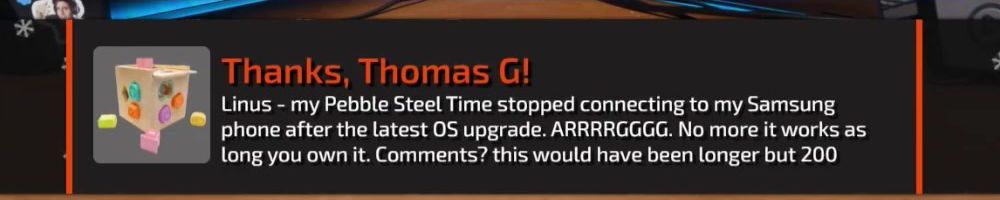 Linus - my Pebble Steel Time stopped connecting to my Samsung phone after the latest OS upgrade. ARRRRGGGG. No more it works as long you own it. Comments? this would have been longer but 200