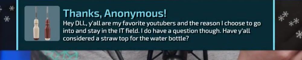 Hey DLL, y'all are my favorite youtubers and the reason I choose to go into and stay in the IT field. I do have a question though. Have y'all considered a straw top for the water bottle?
