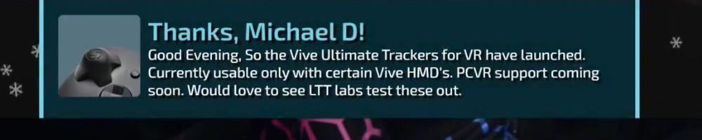 Good Evening, So the Vive Ultimate Trackers for VR have launched. Currently usable only with certain Vive HMD's. PCVR support coming soon. Would love to see LTT labs test these out.