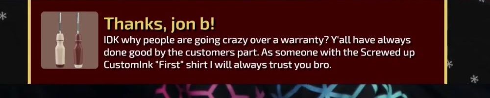 IDK why people are going crazy over a warranty? Y'all have always done good by the customers part. As someone with the Screwed up Customink "First" shirt I will always trust you bro.