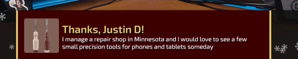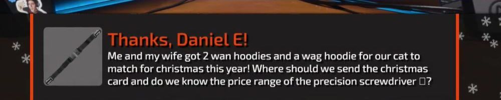 Me and my wife got 2 wan hoodies and a wag hoodie for our cat to match for christmas this year! Where should we send the christmas card and do we know the price range of the precision screwdriver 🤔?