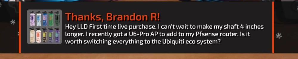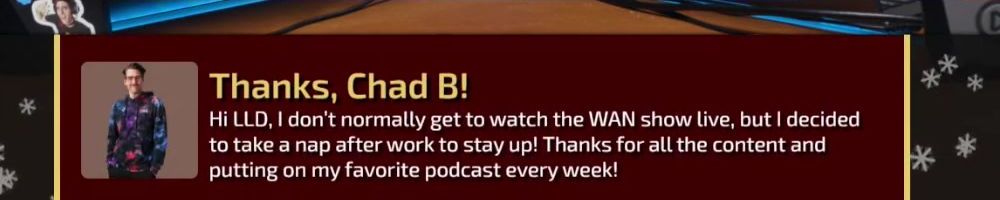 Hi LLD, I don't normally get to watch the WAN show live, but I decided to take a nap after work to stay up! Thanks for all the content and putting on my favorite podcast every week!