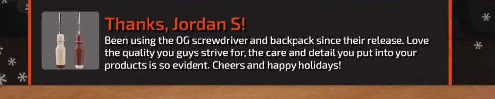 Been using the OG screwdriver and backpack since their release. Love the quality you guys strive for, the care and detail you put into your products is so evident. Cheers and happy holidays!