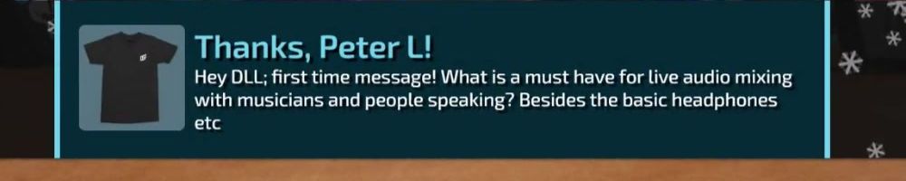 Hey DLL; first time message! What is a must have for live audio mixing with musicians and people speaking? Besides the basic headphones etc