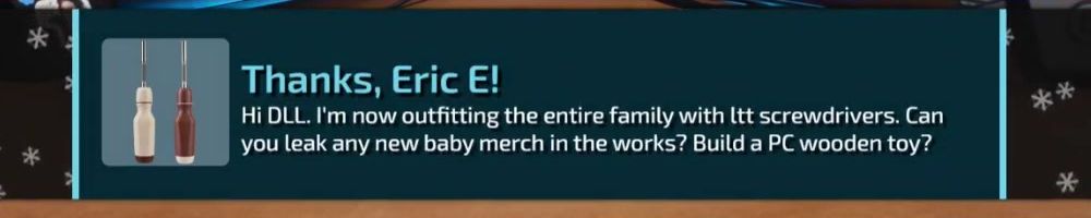 Hi DLL. I'm now outfitting the entire family with ltt screwdrivers. Can you leak any new baby merch in the works? Build a PC wooden toy?