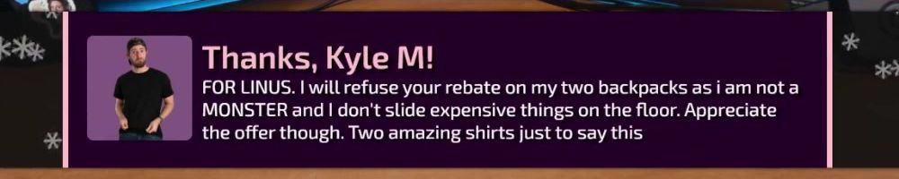 FOR LINUS. I will refuse your rebate on my two backpacks as i am not a MONSTER and I don't slide expensive things on the floor. Appreciate the offer though. Two amazing shirts just to say this