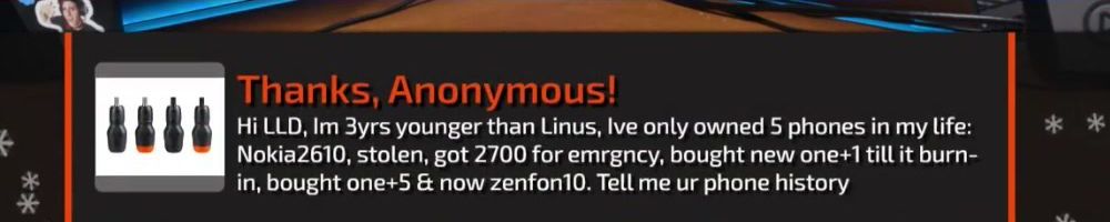 Hi LLD, Im 3yrs younger than Linus, lve only owned 5 phones in my life: Nokia2610, stolen, got 2700 for emrgncy, bought new one+1 till it burn-in, bought one+5 & now zenfon10. Tell me ur phone history