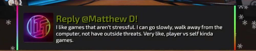 I like games that aren't stressful. I can go slowly, walk away from the computer, not have outside threats. Very like, player vs self kinda games.