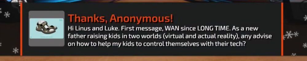 Hi Linus and Luke. First message, WAN since LONG TIME. As a new father raising kids in two worlds (virtual and actual reality), any advise on how to help my kids to control themselves with their tech?
