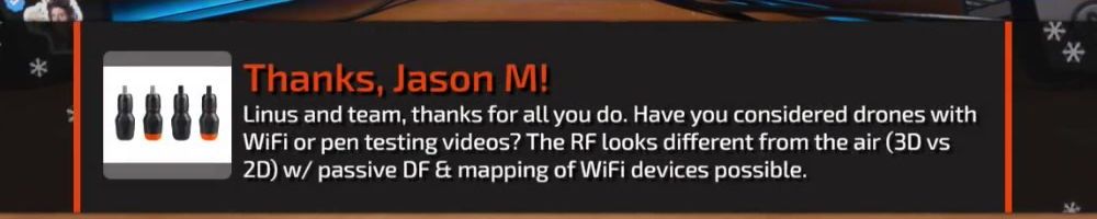 Linus and team, thanks for all you do. Have you considered drones with WiFi or pen testing videos? The RF looks different from the air (3D vs 2D) w/ passive DF & mapping of WiFi devices possible.