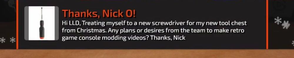 Hi LLD, Treating myself to a new screwdriver for my new tool chest from Christmas. Any plans or desires from the team to make retro game console modding videos? Thanks, Nick