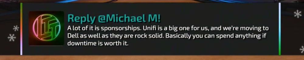 A lot of it is sponsorships. Unifi is a big one for us, and we're moving to Dell as well as they are rock solid. Basically you can spend anything if downtime is worth it.