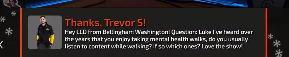 Hey LLD from Bellingham Washington! Question: Luke I've heard over the years that you enjoy taking mental health walks, do you usually listen to content while walking? If so which ones? Love the show!
