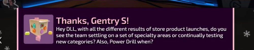 Hey DLL, with all the different results of store product launches, do you see the team settling on a set of specialty areas or continually testing new categories? Also, Power Drill when?