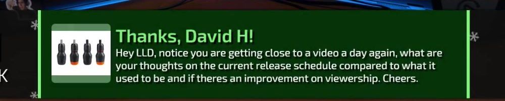 Hey LLD, notice you are getting close to a video a day again, what are your thoughts on the current release schedule compared to what it used to be and if theres an improvement on viewership. Cheers.