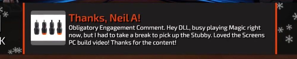 Obligatory Engagement Comment. Hey DLL, busy playing Magic right now, but I had to take a break to pick up the Stubby. Loved the Screens PC build video! Thanks for the content!
