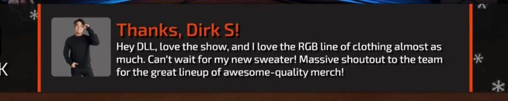 Hey DLL, love the show, and I love the RGB line of clothing almost as much. Can't wait for my new sweater! Massive shoutout to the team for the great lineup of awesome-quality merch!