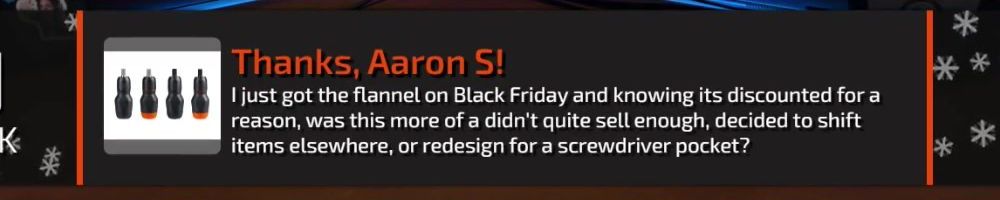 I just got the flannel on Black Friday and knowing its discounted for a reason, was this more of a didn't quite sell enough, decided to shift items elsewhere, or redesign for a screwdriver pocket?