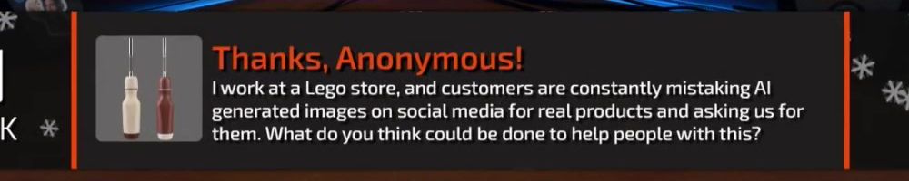 I work at a Lego store, and customers are constantly mistaking AI generated images on social media for real products and asking us for them. What do you think could be done to help people with this?