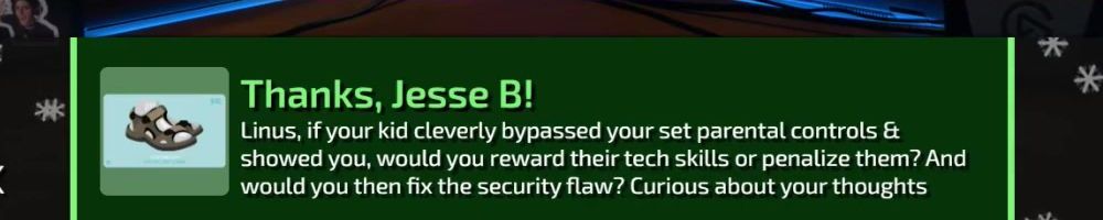 Linus, if your kid cleverly bypassed your set parental controls & showed you, would you reward their tech skills or penalize them? And would you then fix the security flaw? Curious about your thoughts