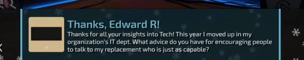 Thanks for all your insights into Tech! This year I moved up in my organization's IT dept. What advice do you have for encouraging people to talk to my replacement who is just as capable?